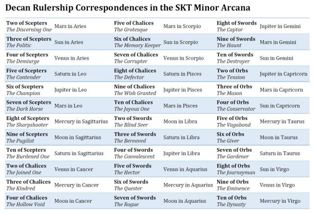 Here’s the table for the Minor Arcana pip cards correspondences to the decan rulers:
