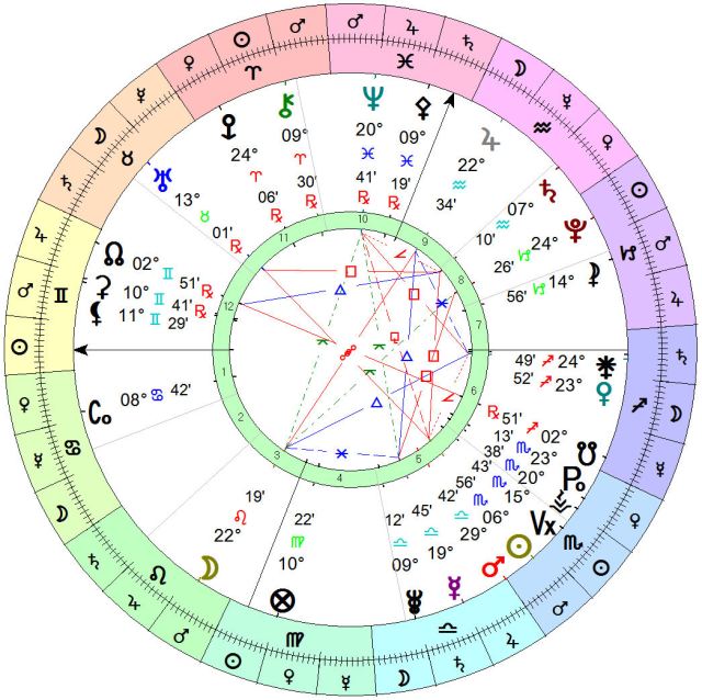 For determining which Major Arcana Septenary dominates Quadrant 1 of your birth chart, locate Houses 1, 2, and 3. In the above chart for Albert Camus, the house numbers are designated along that inner green circle. So here it’s Virgo (House 1), Libra (House 2), and Scorpio (House 3).
