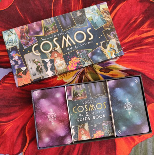 The Cosmos Tarot and Oracle is per the namesake– a two deck and book set, one deck being tarot and the other an astronomy-based oracle deck– that comes in a slim, handsome keepsake box.