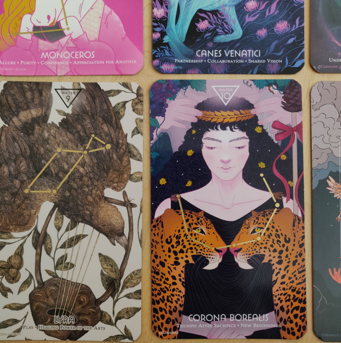 The deck showcases modern constellations and celestial bodies in our universe, with many of those astronomical phenomena personified through classical mythology. These representations of our skies, in picture form, illustrated by over 100 different artists, produces a work of oracular potential.