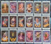 There’s a lot of astrology to this deck. The Princesses in the court cards (the Pages) personify the seasons, which I personally then extrapolated out to tie in with the equinoxes and solstices. The Princess of Wands is Summer, Cups is Autumn, Swords is Winter, and Pentacles for Spring.