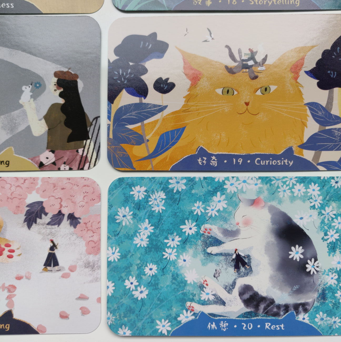 Each cat depicted is larger than life, in scale to the humans pictured on the cards. I love that! These cards are 24 archetypes of the human soul, manifested as cat spirits. Aw, look at the Cat of Rest– I’m amused by the role reversal between the human and the cat here.