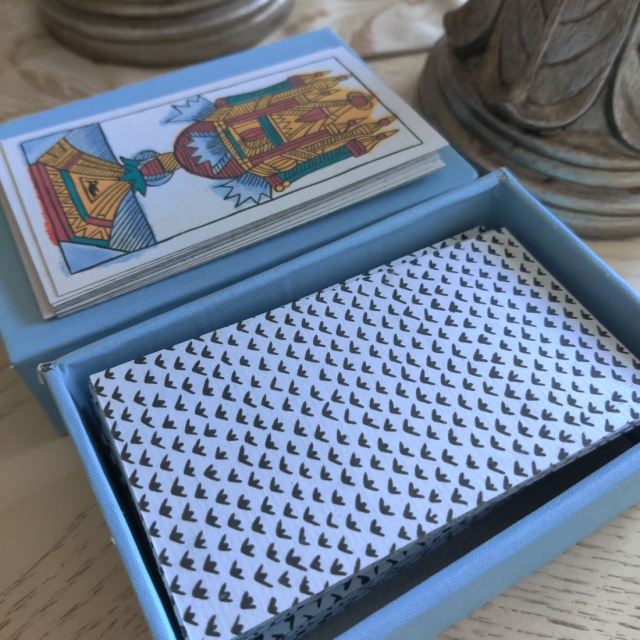 You can view 18th century originals of the Dodal online: the 1701 – 1715 edition at the Bibliothèque nationale de France and the 1701 – 1732 edition at the British Museum. You’ll see how the descriptions for all of these historical decks in museum collections note that the cards are printed on pasteboard.