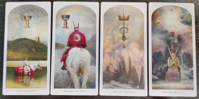 Those who aren’t a fan of the RWS swords-piercing-a-heart motif in the Three of Swords will really appreciate this deck, and how the creators depicted the Three of Swords (left most card up top). And that’s a stunning composition for the Four of Swords.