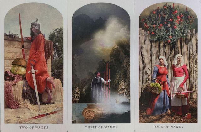 Here in Bauer’s deck, I love the historical research that went into constructing a fantastical fictional narrative and presenting that as the premise of the deck. It’s world-building at its finest. Look at the detailing in the Page of Coins, that overlay of a medieval painting behind the photographic art.