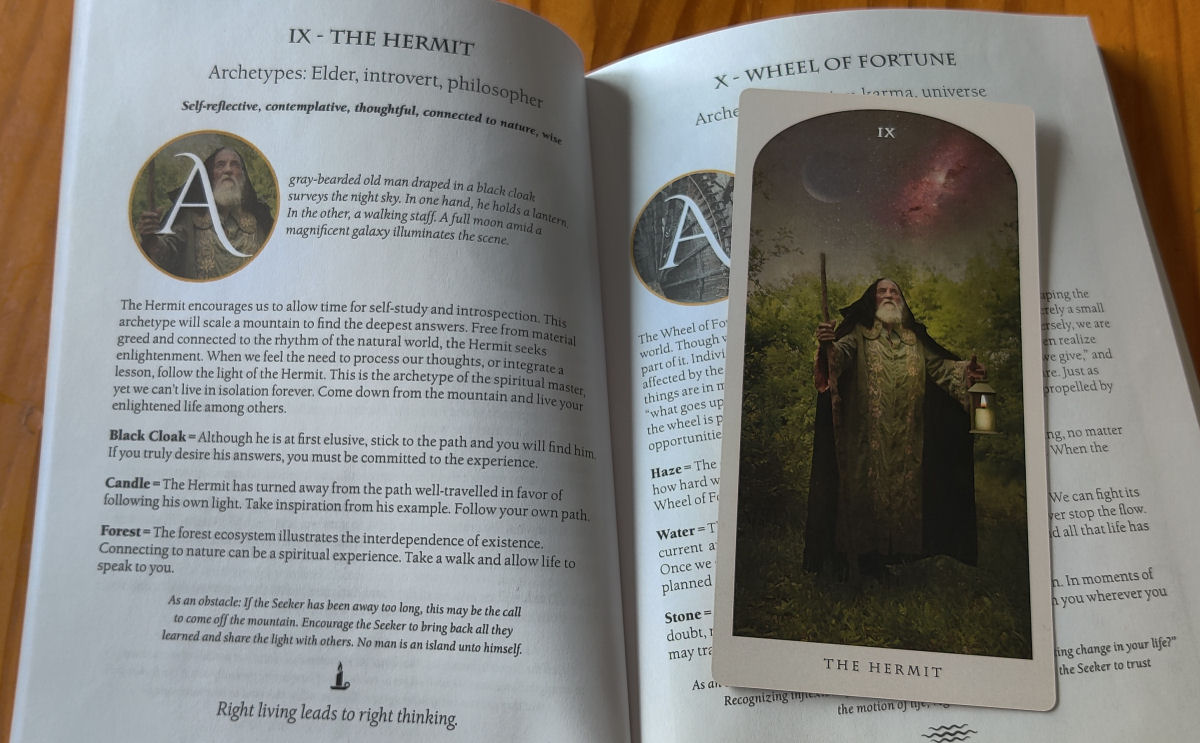 For example, archetypes associated with Key 0 – The Fool: The Eternal Youth, The Child, or The Traveler. Archetypes associated with Key 1 – The Magus: The Inventor, The Builder, or The Catalyst. Key 2 – The High Priestess: The Goddess, The Divine Feminine, or The Wise Leader. And in the photo above, you see that The Hermit corresponds with the archetypes of The Elder, The Introvert, and The Philosopher.