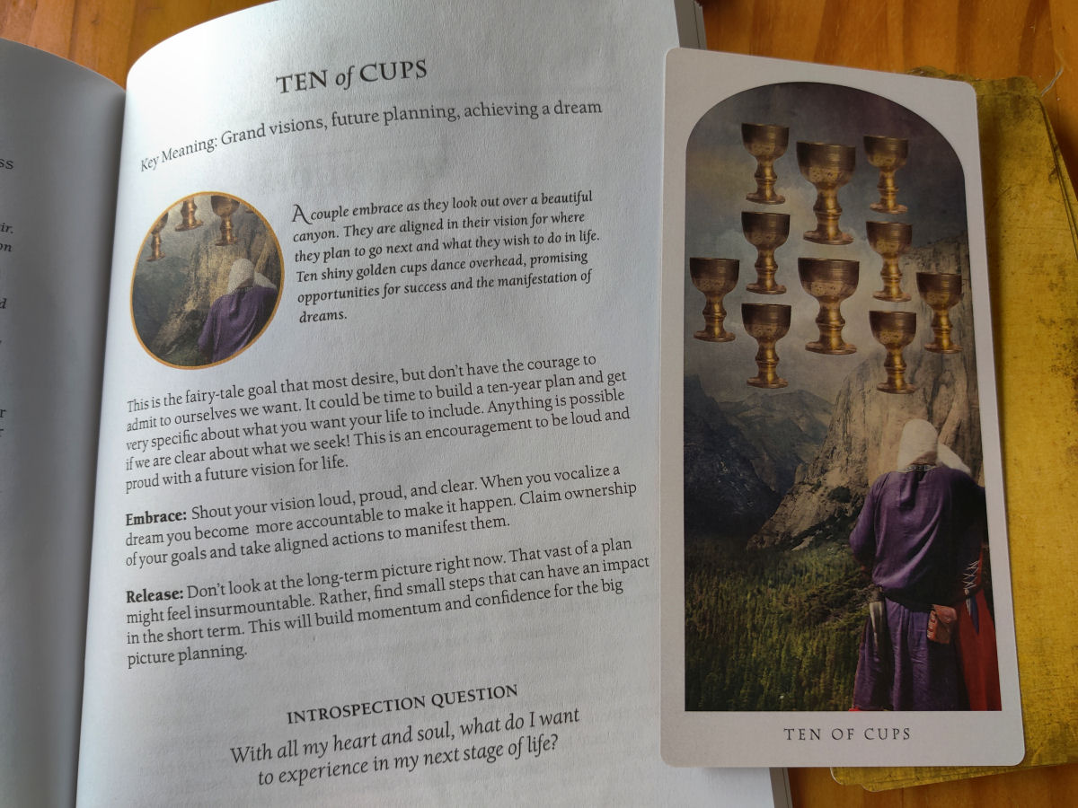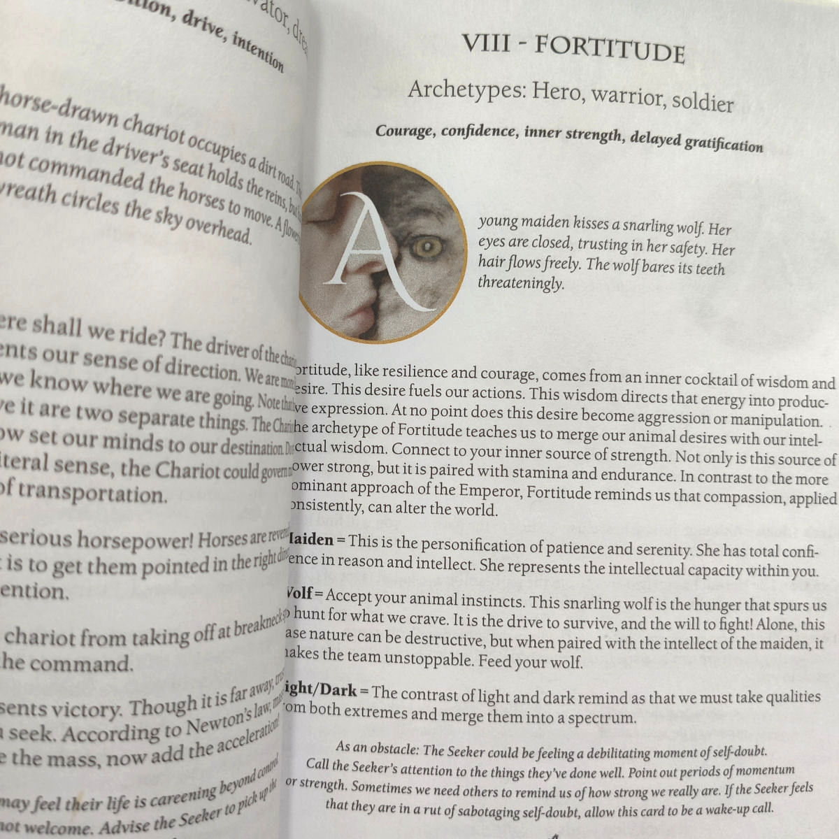I love how the guidebook annotates the anatomy of each card, covering three key symbols. For example, in Death, the three key symbols specifically important to The Lost Tarot are the dove, the plague, and the green shroud. In this deck’s Temperance, it’s the sun, water, and the angel.