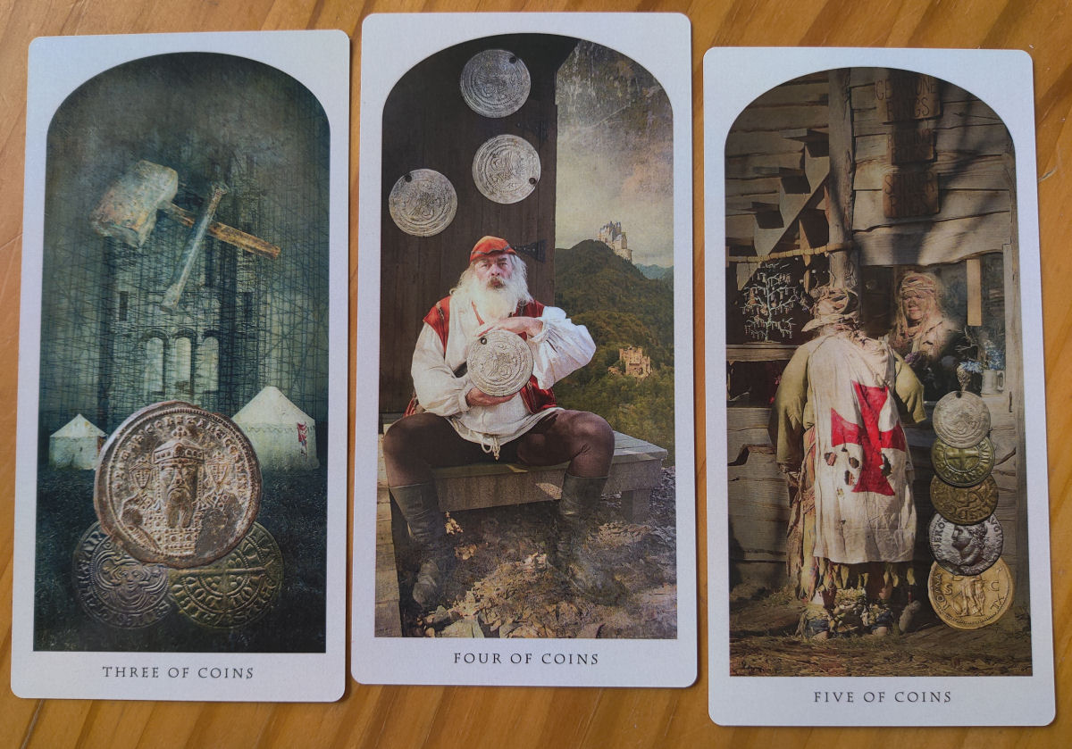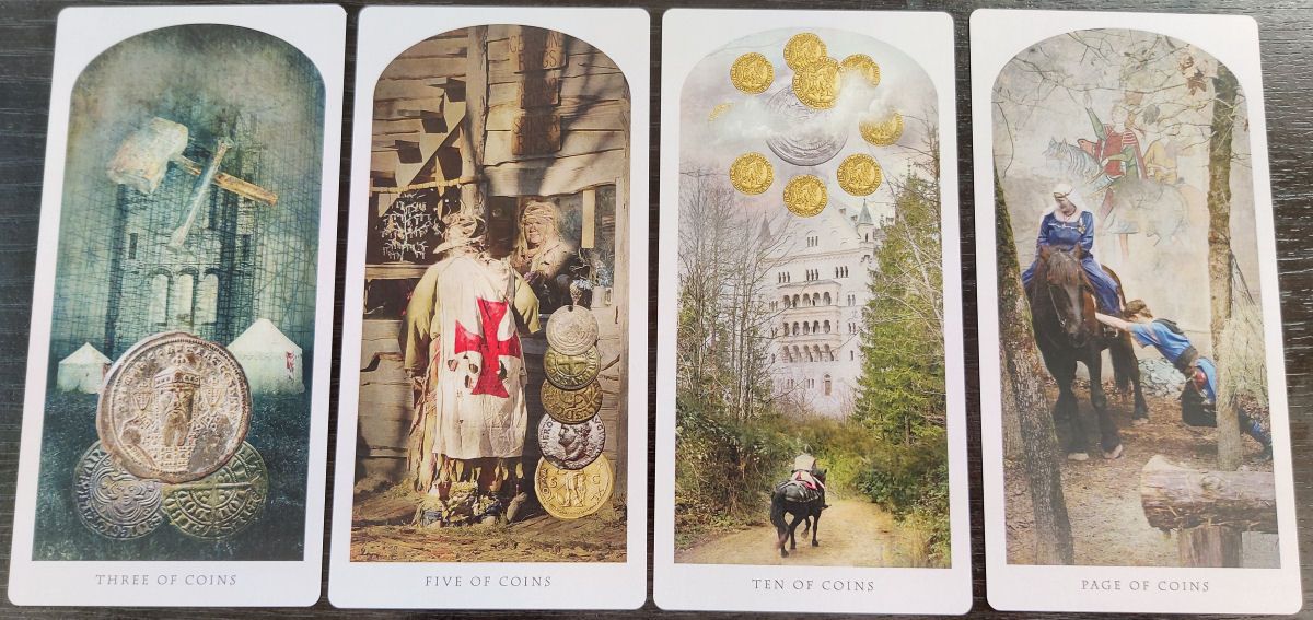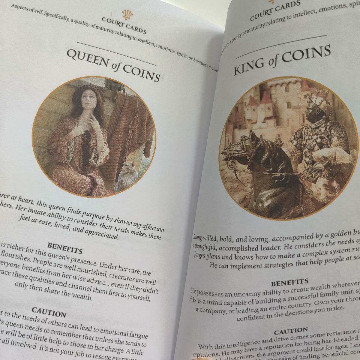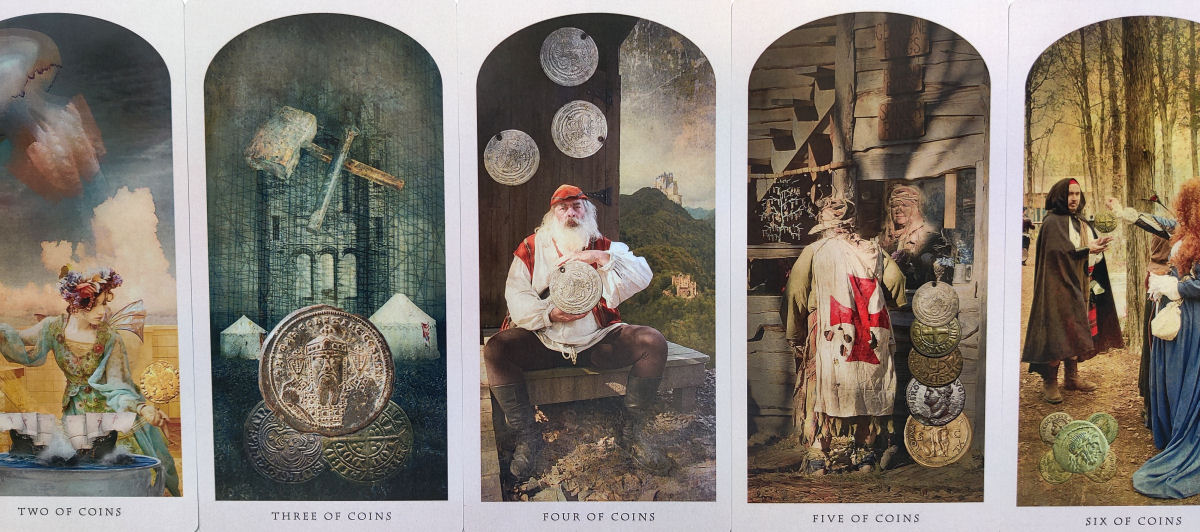 Here in Bauer’s deck, I love the historical research that went into constructing a fantastical fictional narrative and presenting that as the premise of the deck. It’s world-building at its finest. Look at the detailing in the Page of Coins, that overlay of a medieval painting behind the photographic art.