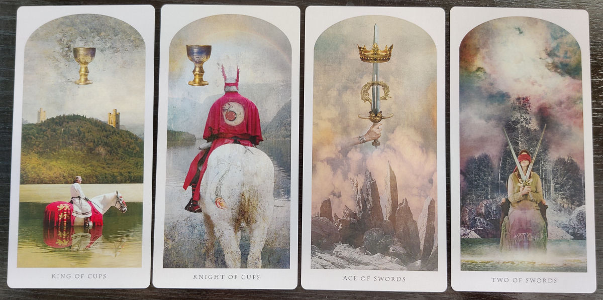 Those who aren’t a fan of the RWS swords-piercing-a-heart motif in the Three of Swords will really appreciate this deck, and how the creators depicted the Three of Swords (left most card up top). And that’s a stunning composition for the Four of Swords.