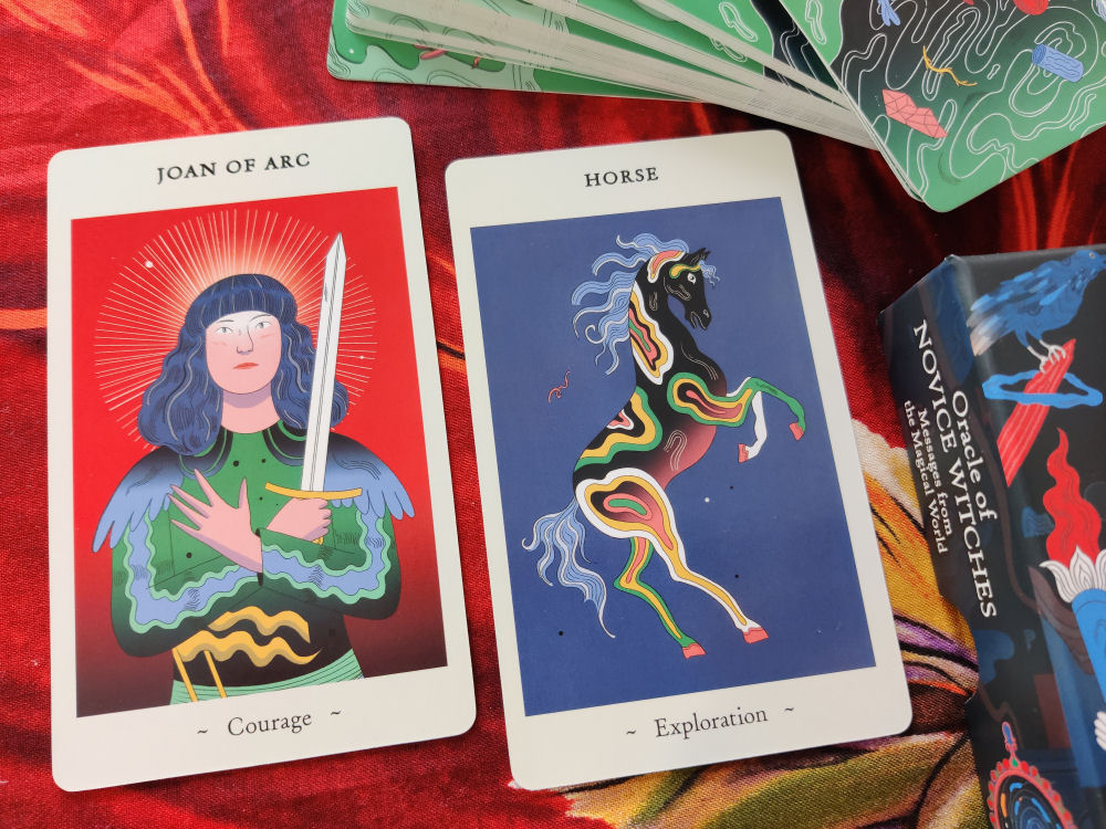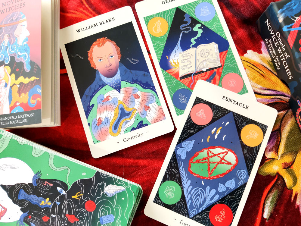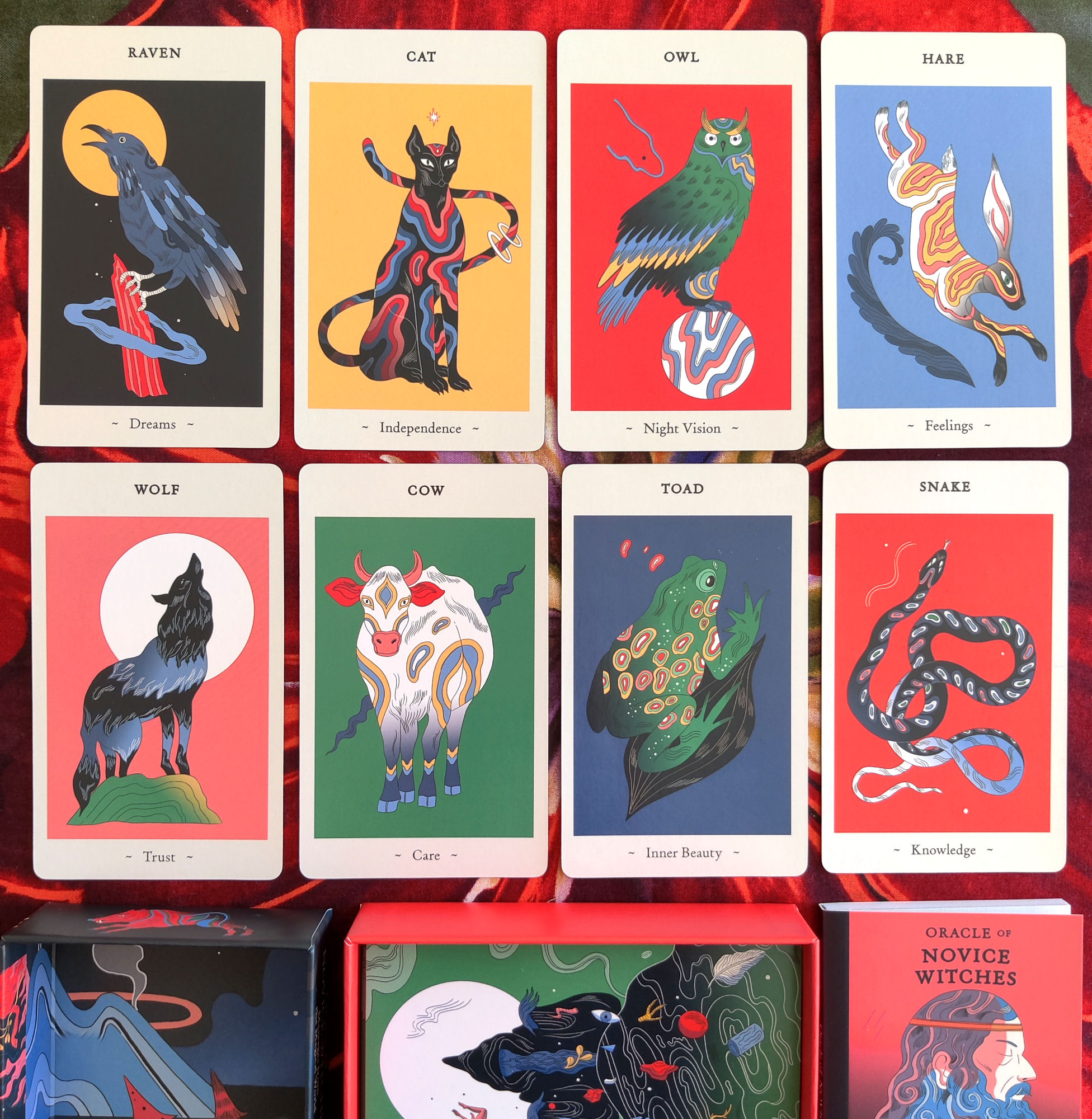 Oracle of Novice Witches is a 50-card deck featuring 24 witches and wizards from history and folklore, 13 tools of the craft, and 13 animal familiars. The deck was created by Francesca Matteoni and with art by Elisa Macellari.