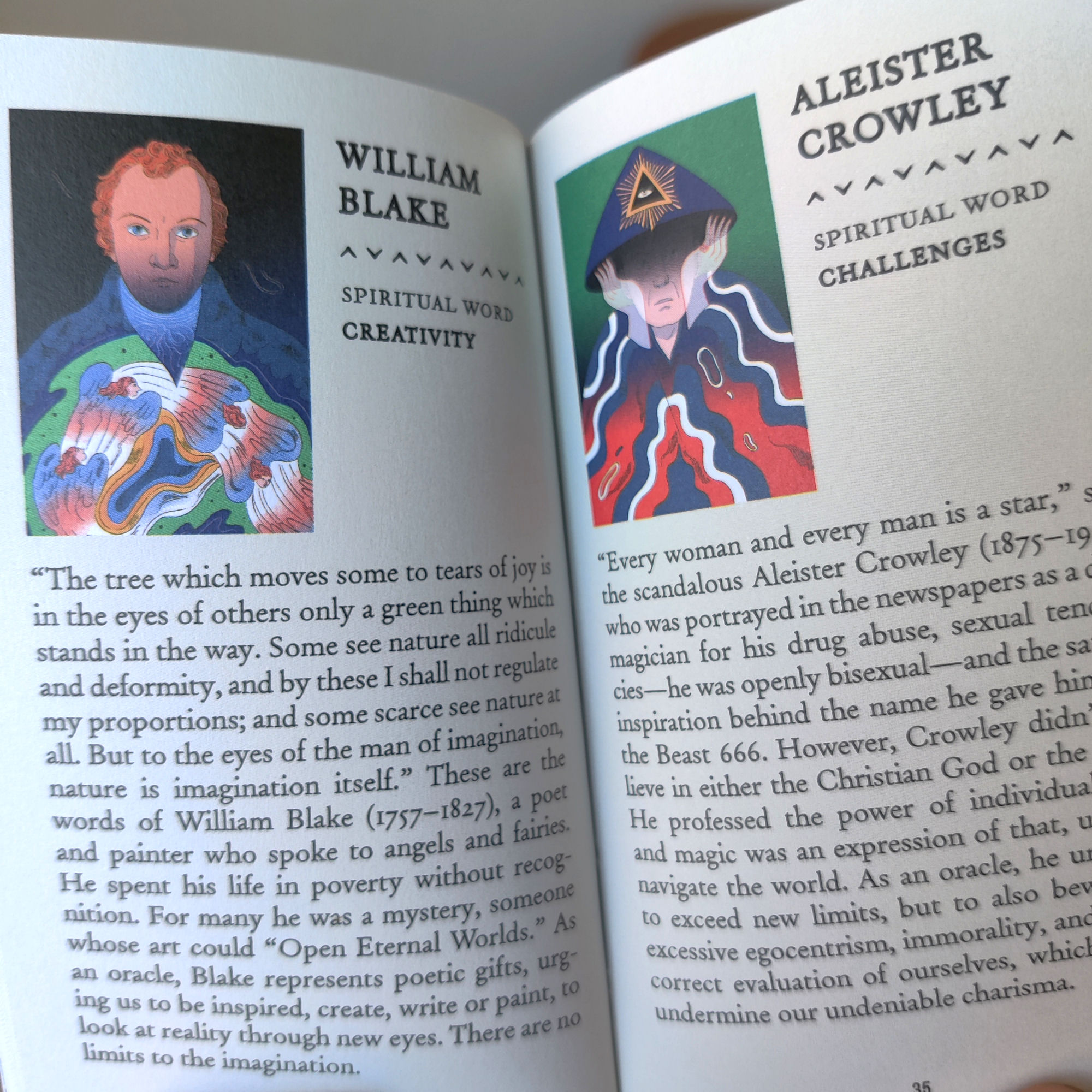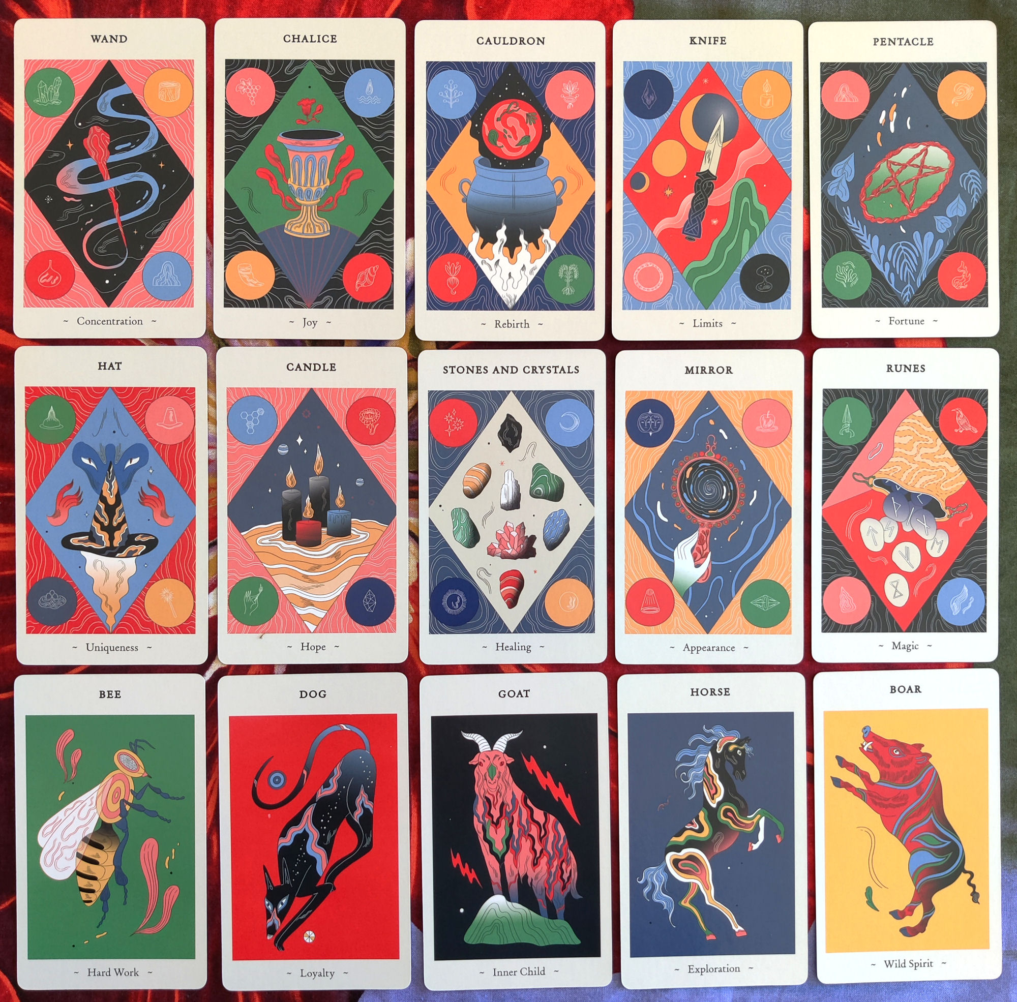 The full-color guidebook accompanying the cards features a profile summary of every witch and wizard depicted. Entries for the tools of craft define each tool’s purpose and how it’s generally used. For the familiars, animal symbolism and correspondences are provided.