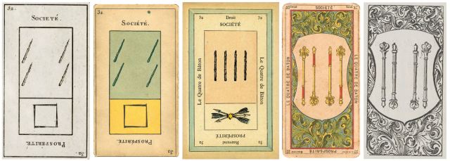 I’m currently working on the Four of Wands. The left-most two above are from Etteilla I, then the center is Etteilla II, and the right-most two are Etteilla III.