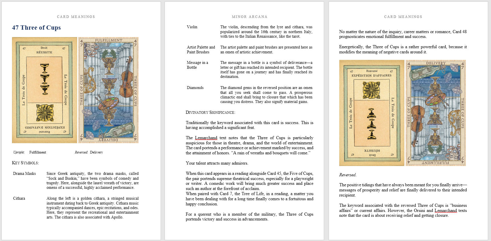 For each card entry, I translate both the Lemarchand and Orsini texts from French to English, then use those texts as reference as I write my own card entry. Although the guidebook is keyed to my illustrations, one of my objectives is for it to also work as a standalone book on reading Etteilla decks.
