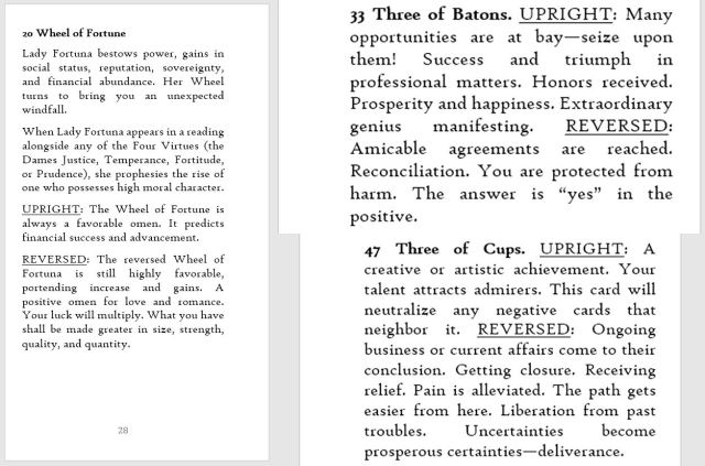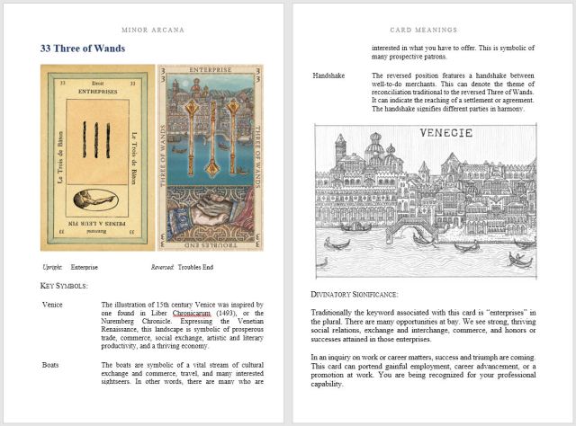 The above screenshot is just a sampling of the layout for the card entries. I think having that side by side comparison of the Etteilla II and my version is helpful. In many of the entries, images from the other Etteillas are also provided. The featured version is the Lismon Etteilla II only because it’s the one I have high-res image files of.