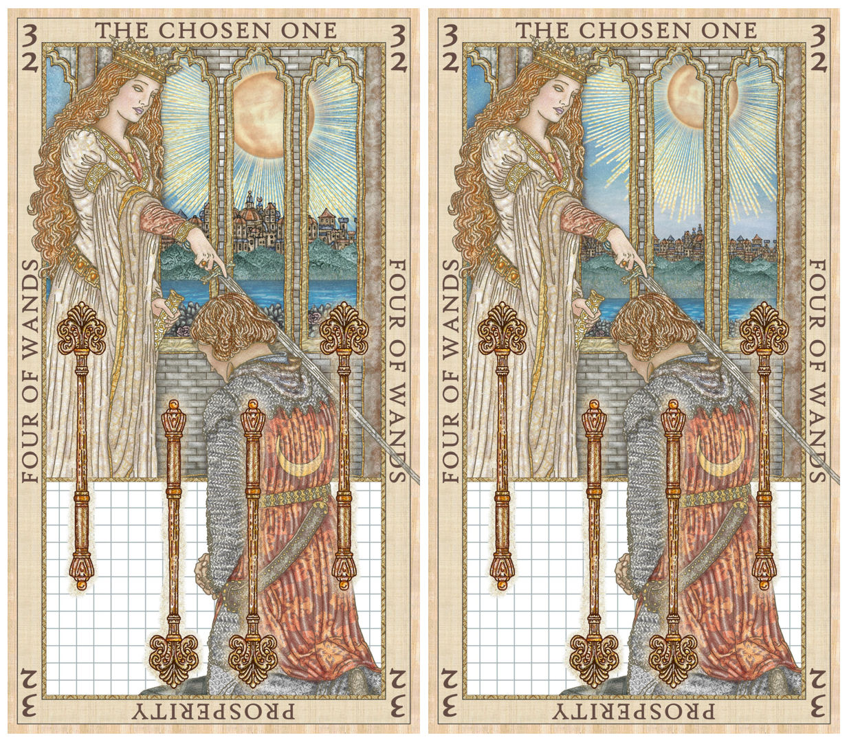 You’re about to see a bunch of different versions, with minor variations, of my Four of Wands work-in-progress. Still tinkering around to figure out exactly what I want.