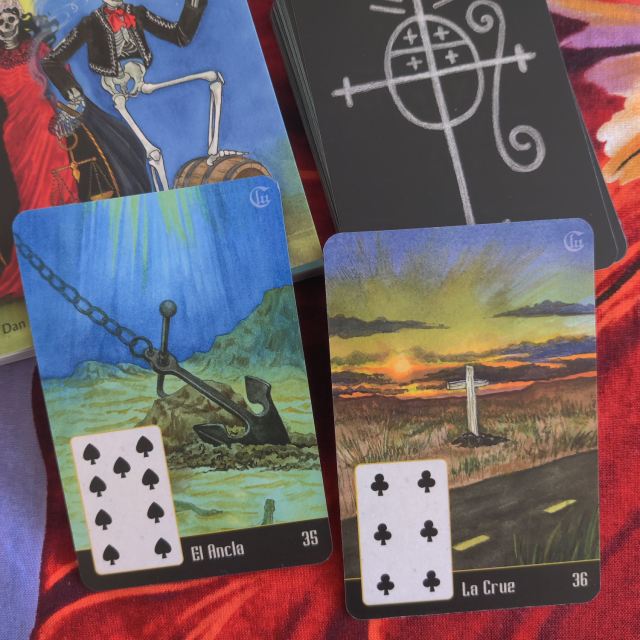 Santisima Muerte is associated with love, healing, protection, financial well-being, justice, and safe journeys into the afterlife. Meanwhile Senora de las Sombras (Lady of the Shadows) is oft invoked for protection by workers of the night and those who live on the fringes of society. A Santa Muerte oracle deck would need to pay homage to those elements, and this Lenormand deck delivers.
