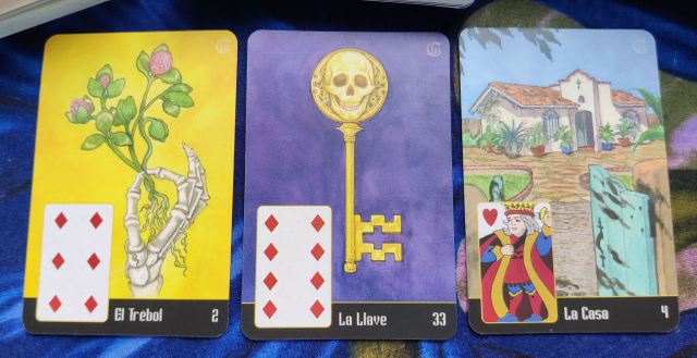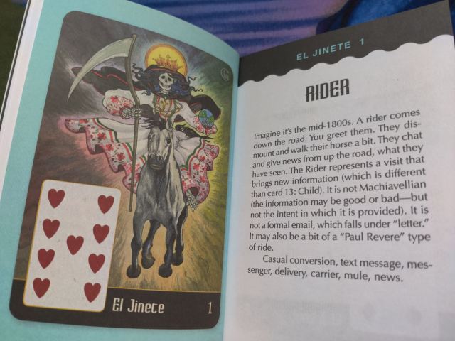 By the way I’m loving the product design, the matte finish, rich colors, the card titles in Spanish, sigil on the card backs, and the perfect little companion guidebook by Pelletier that comes with this deck set.