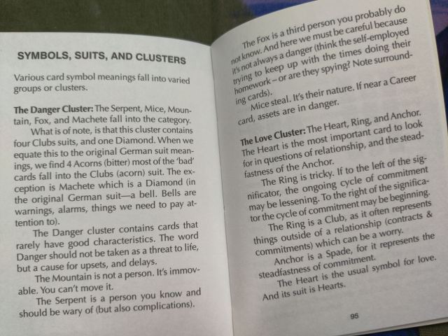 The guidebook offers great insights into how to read the Lenormand. In a reading, consider what purpose the object pictured serves, or what our common associations are to that symbol. Those correspondences are the connecting link to revealing the answer to your question.