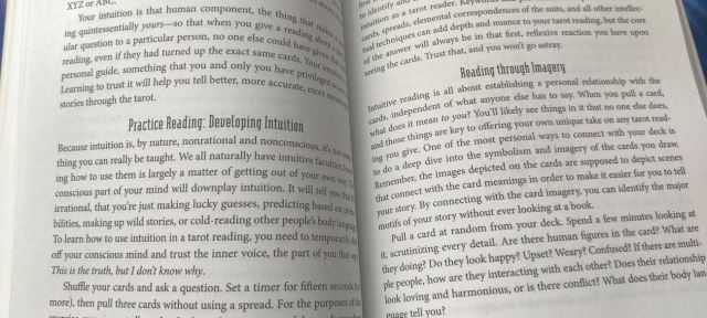 This is a book you can read cover to cover, making your way through its given sequence of tarot cards for study. Or dip into and spot-read depending on your interests. The card meanings section is comprehensive, and will easily become the most practical and indispensable resource you have to get straight to the point of what the cards in your reading mean.