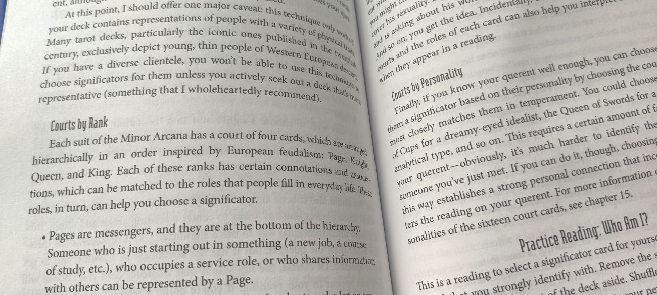Thus, for instance, Part I: Practical opens with preliminary considerations for the beginner tarot reader, from choosing a deck to keeping a tarot journal and daily draws. How do you phrase questions to optimize the answers that the cards give, and how do we balance both psychology-based and mystical rationales– these questions and more are explored in the first 30 pages.