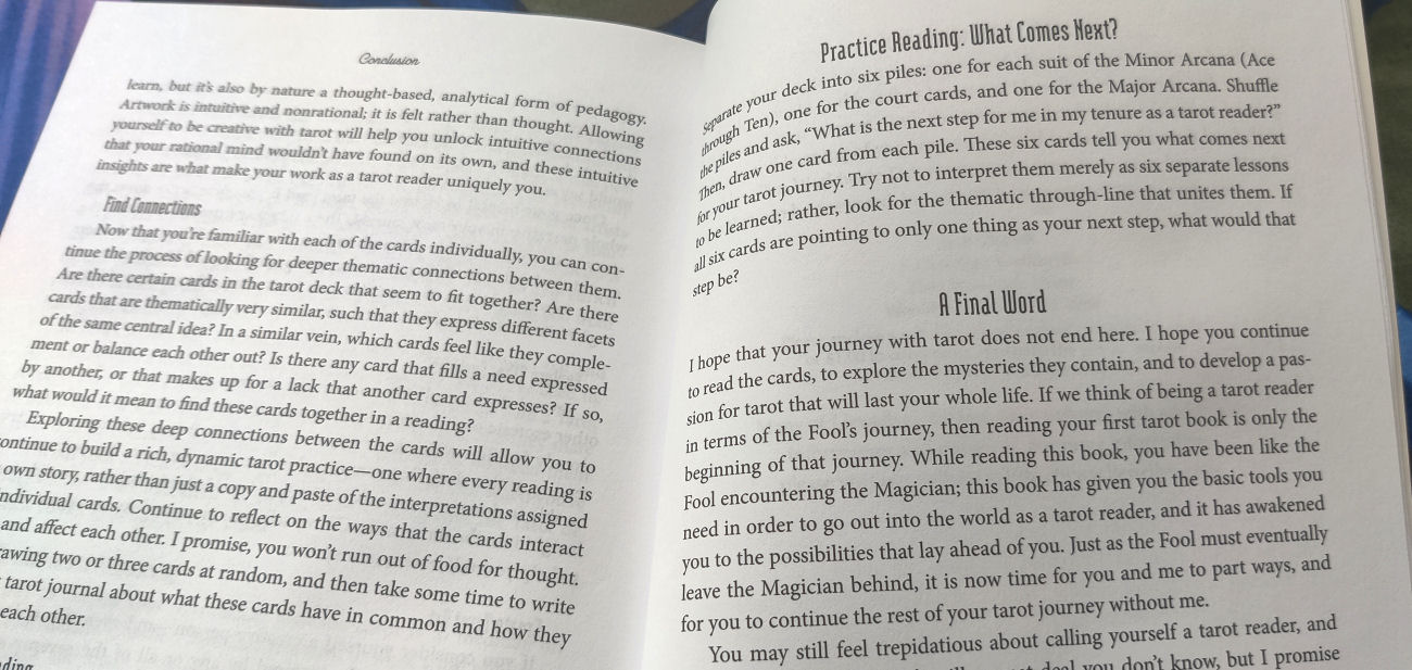 The concluding chapter offers great advice on next steps in the event a reader wants to advance in their tarot practice. The advice ranges from exploring other decks from the one you’ve learned on, other deck systems; using the tarot for pathworking or meditation; creating tarot art; and continuing your tarot education with other books from different perspectives.