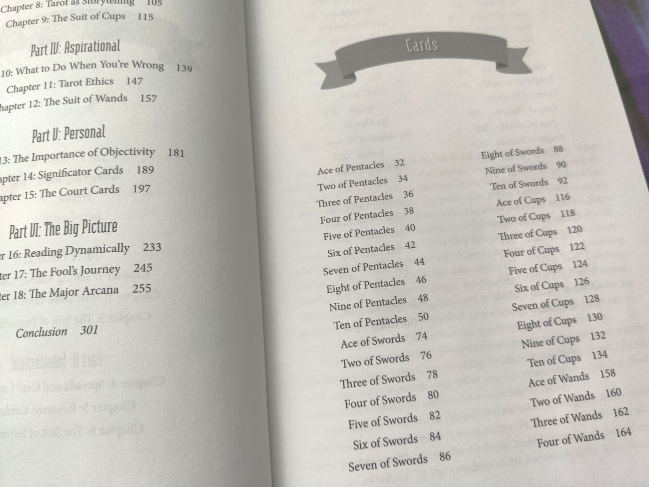 The structure and layout of the book also makes it user-friendly, and the go-to reference you’ll want at your fingertips. If you’re looking up a specific card, there’s a separate table of contents in the front pages just for the 78 cards.