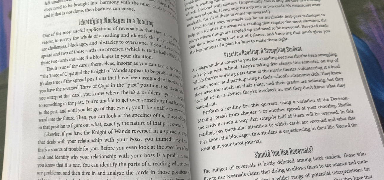 This is a book you can read cover to cover, making your way through its given sequence of tarot cards for study. Or dip into and spot-read depending on your interests. The card meanings section is comprehensive, and will easily become the most practical and indispensable resource you have to get straight to the point of what the cards in your reading mean.