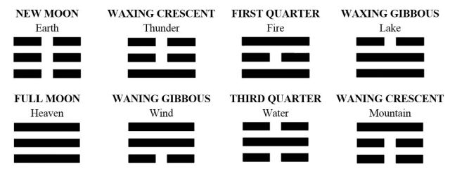 Note how the full moon phase correspondence, Heaven, is the polarity of the new moon correspondence, Earth. A waxing crescent plus a waning gibbous, as it appears to us, equals a whole. Likewise, the yin (broken) lines of Thunder transform into yang (solid) lines in Wind, and the yang lines into yin. Fire and Water are balanced opposites neutralizing one another, corresponding respectively to the first quarter and third quarter moons. And same with the balance of yin and yang in the waxing gibbous plus the waning crescent moons.