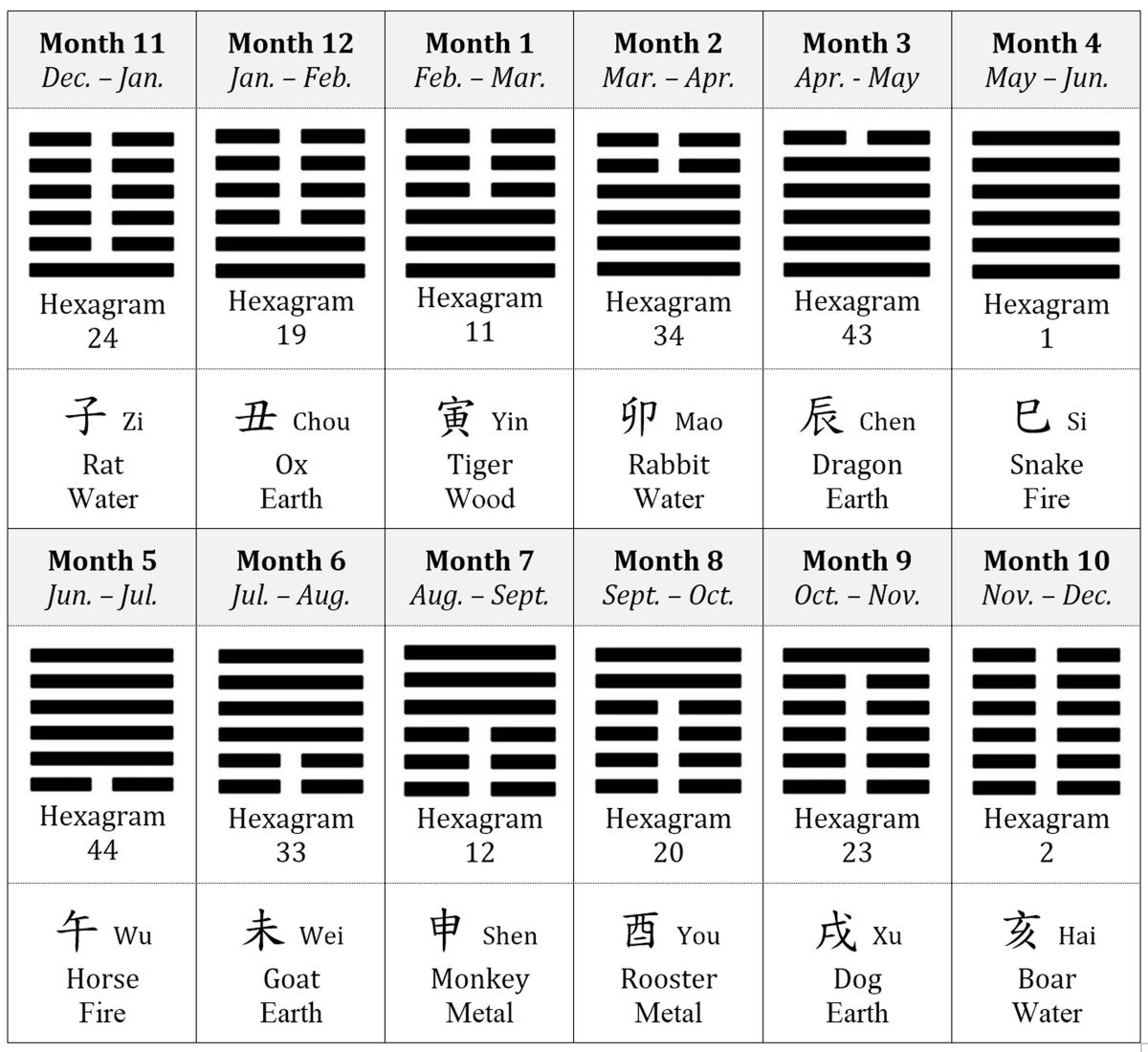 The trigram and I Ching hexagram correspondences express the qi energy quality of each seasonal point, i.e. the broken lines express the yin quality and the solid lines express the yang quality. So, for example, of the Twelve Hexagrams of the Son of Heaven 天子卦, lunar month 10, corresponding to November – December, is expressed by all 6 yin lines (cold), whereas lunar month 4, around the summer solstice, is expressed by all 6 yang lines (heat).