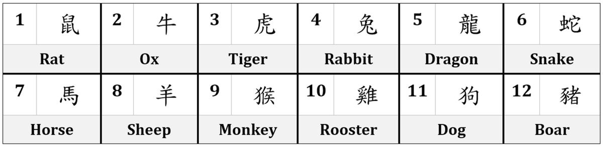 The twelve moons of one lunar year are expressed as twelve zodiac animal signs as noted in the table above. So not only does each zodiac animal correspond with a lunisolar year (e.g., Year of the Tiger, Year of the Rabbit, etc.), each also corresponds with a lunar month (or cycle), new moon through full and ending with the dark moon.