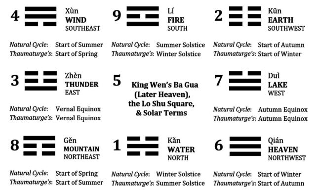 As noted in the video, there are differing orders of trigram to directional and seasonal correspondences. The above is a diagram of what I refer to as the thaumaturgical order, as it’s the one most likely to be utilized in ritual magic and alchemy.