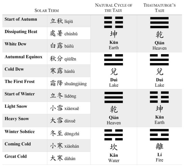 Thus per the Thaumaturge’s Cycle, the trigram Fire corresponds with the winter solstice, as that is when the magus or alchemist would most want to harness the qi power of Fire.