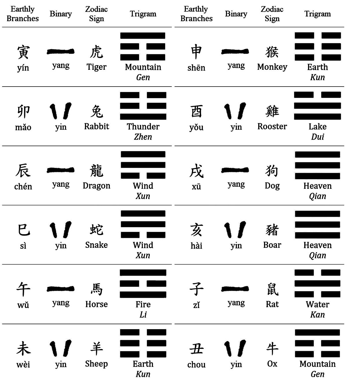 The earthly branches, marking both moon phases and ascendant hours, correspond to the Ba Gua eight trigrams as follows: