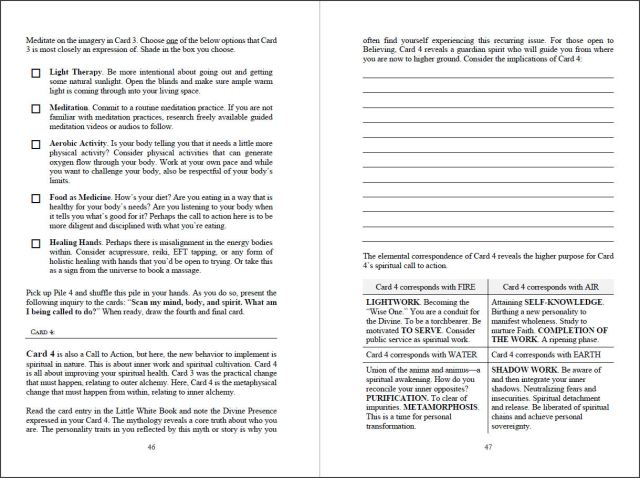 After that you’ll arrive at the Seeker’s Tarot Reading. The sequence of work after that are related to discovery of various esoteric sciences where you’ll master the basics in astrology, numerology, Hermetic Qabalah, and the I Ching, along with exercises that walk you through how to apply, in a practical way, the Maya numeral references in the bottom right corners of the cards, the trigrams, etc.