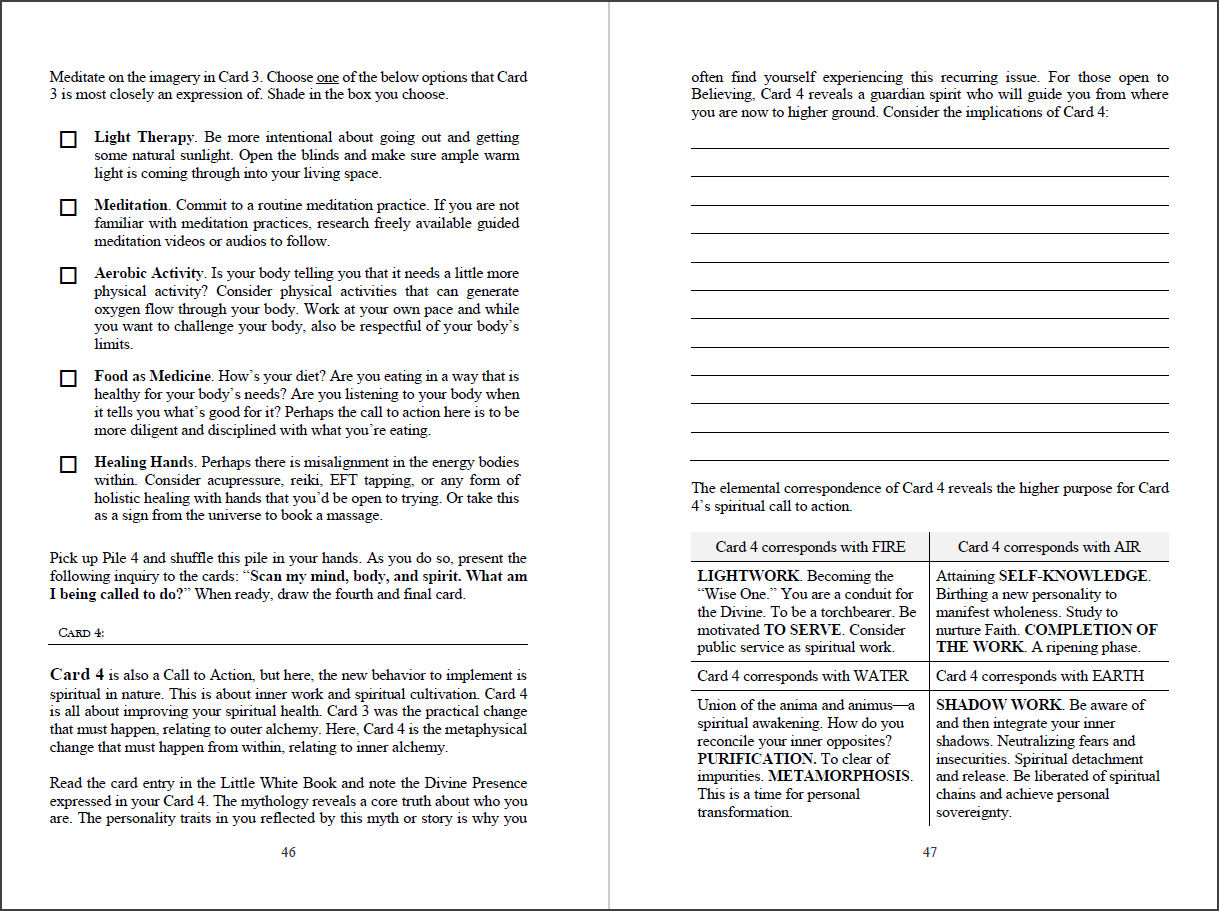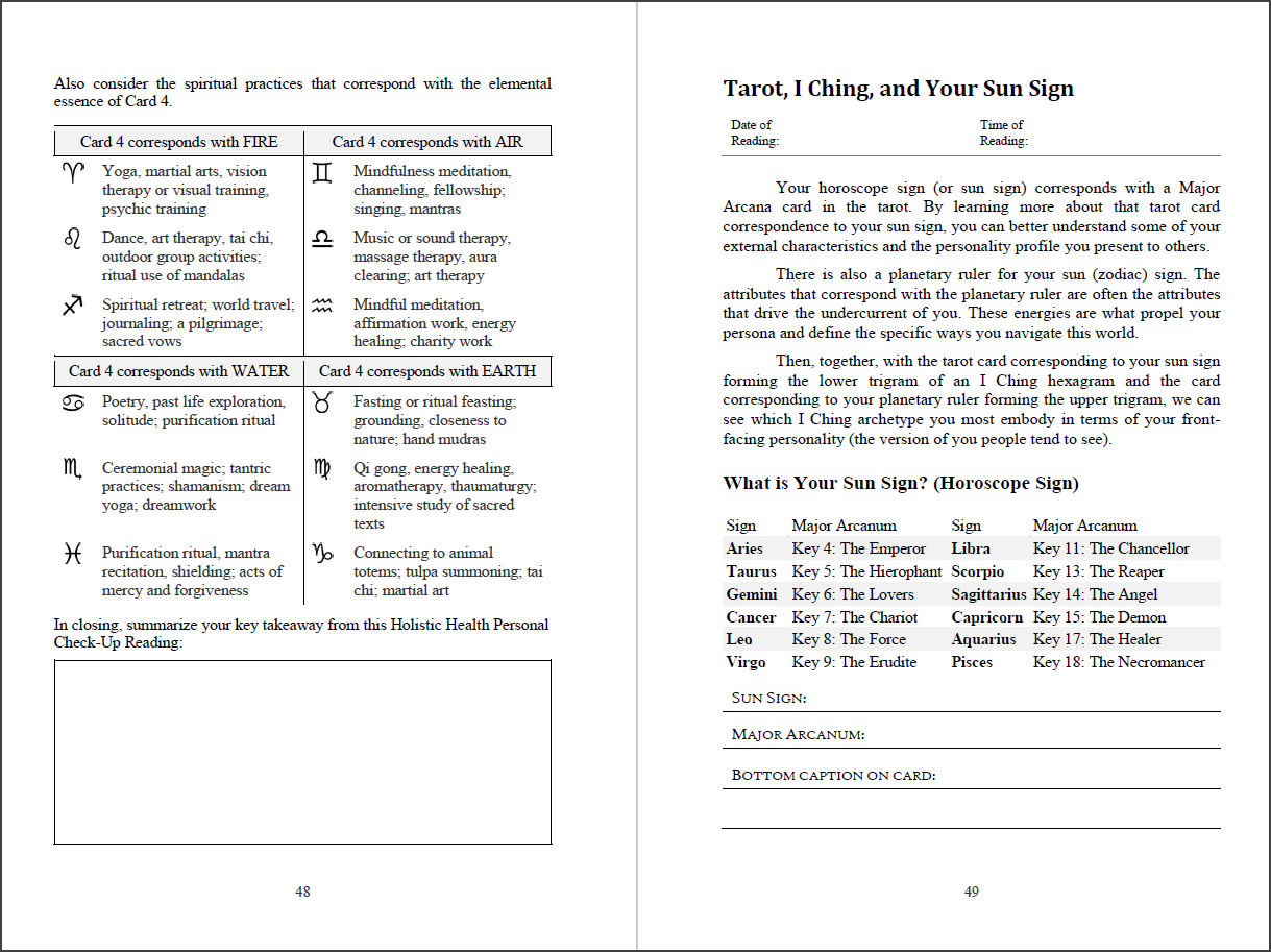 Freewrite self-reflections inspired by the card associated with your sun sign, and the I Ching hexagram produced as a result of the trigram assigned to your deck’s Order and the trigram of your sun sign. Work through a revelatory exploratory exercise to better understand your life purpose.