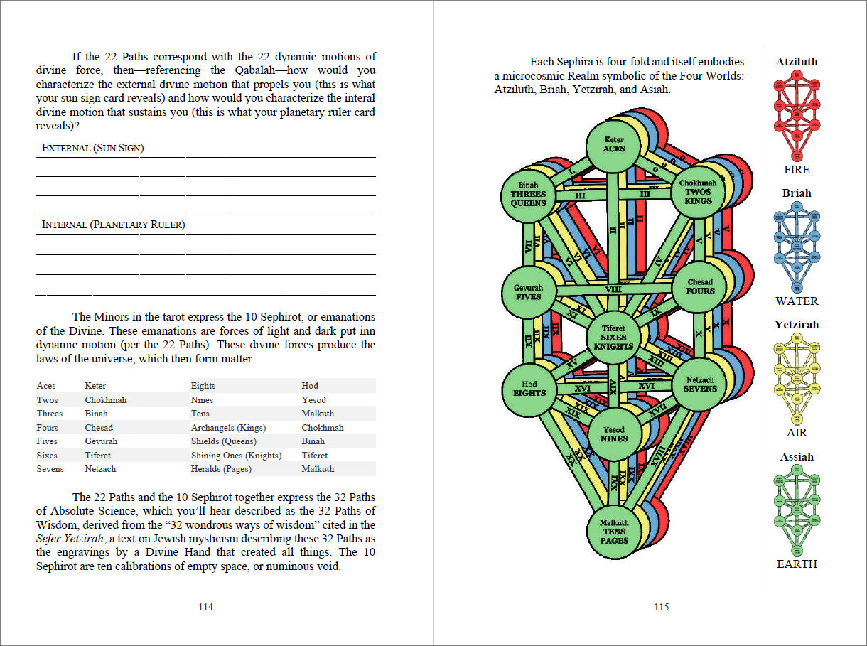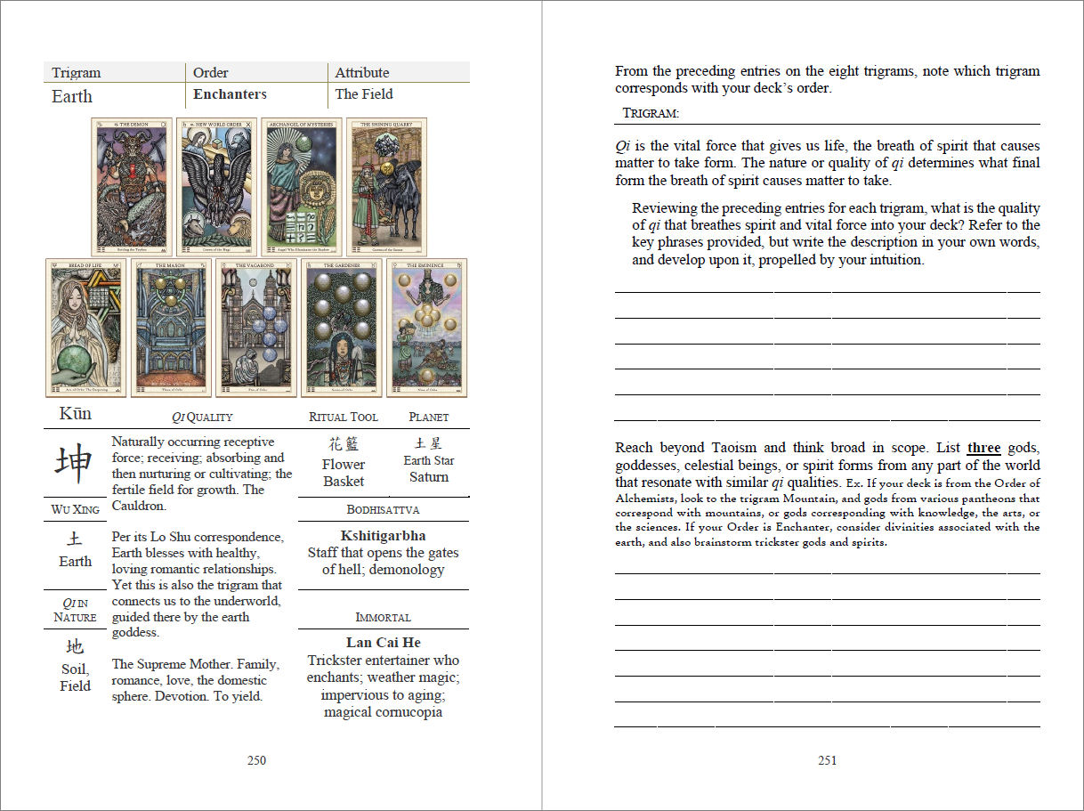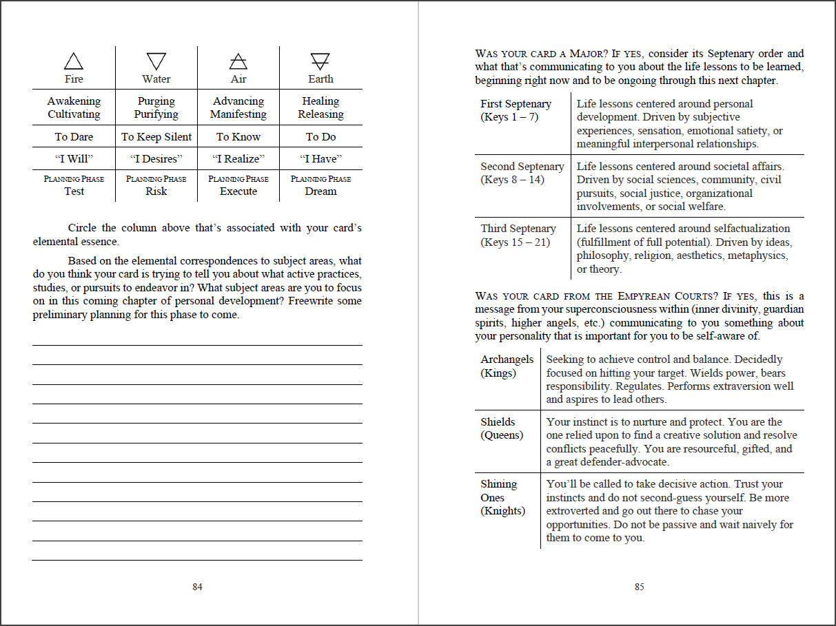 After that you’ll arrive at the Seeker’s Tarot Reading. The sequence of work after that are related to discovery of various esoteric sciences where you’ll master the basics in astrology, numerology, Hermetic Qabalah, and the I Ching, along with exercises that walk you through how to apply, in a practical way, the Maya numeral references in the bottom right corners of the cards, the trigrams, etc.