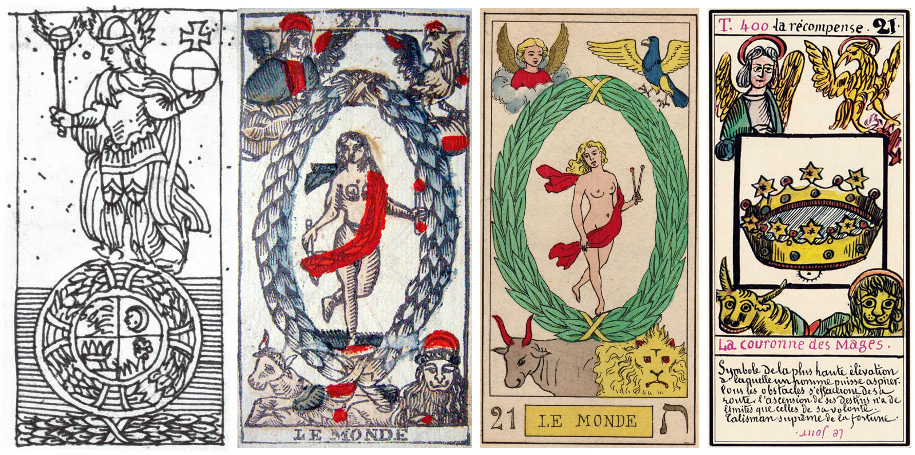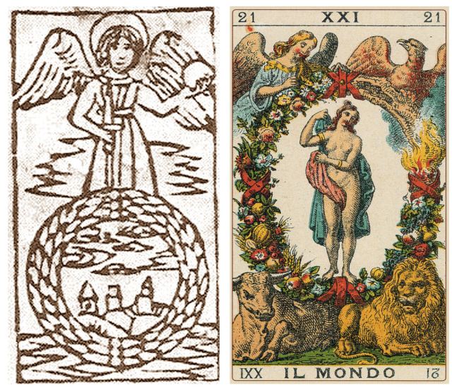 Key 21 from the Rosenwald Tarot Uncut Sheets (1501), Key 21 from the Soprafino Tarot (1835)
