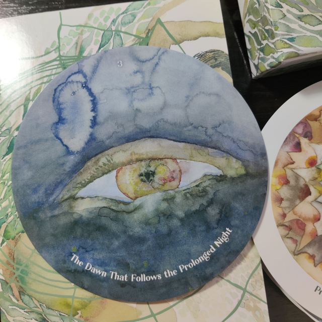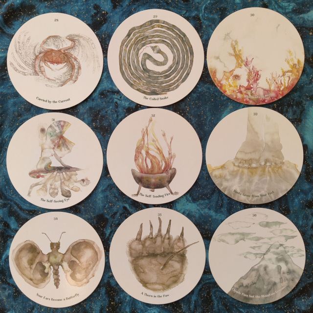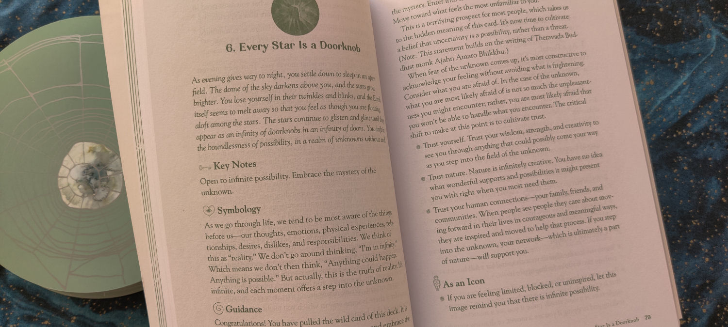 The numbered cards are designed to support a sequential structure where you begin with 1. The Dark Solstice of the Sun on the day of the winter solstice, which happens to be today, the day this review is being posted. A week later, you move on to the second card, You Don’t Know Where You Are, but You Are Free, and so on throughout the year. The Exploding Star, Card 27, is timed to the summer solstice.