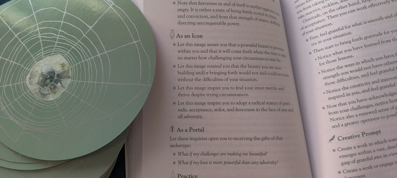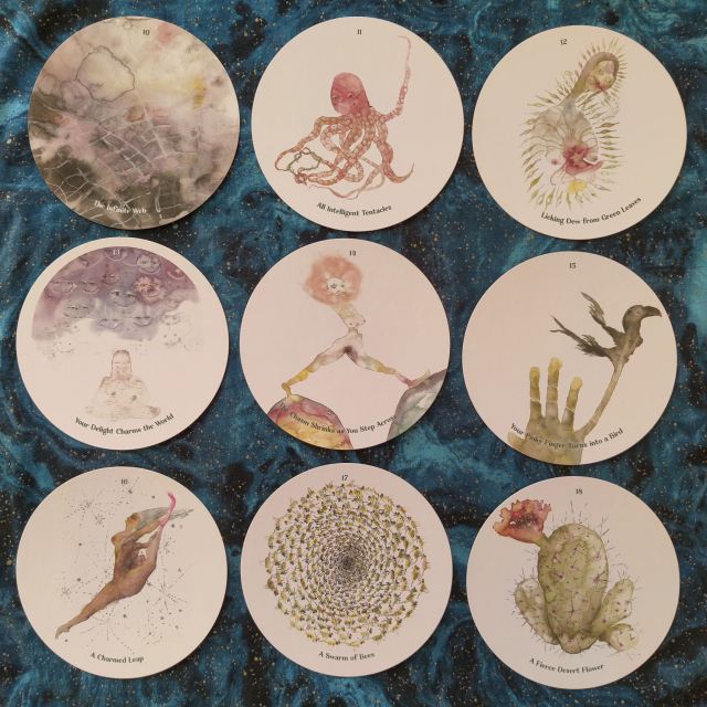 These prayer cards inspire stillness. “Sometimes the most positive and radical actions are stillness, observation, and quiet.” I love how the creators describe the Cantigee Oracle as “the Swiss Army knife of oracle decks.” Not only can you use it for divinatory insight, but it has many other functions as well.