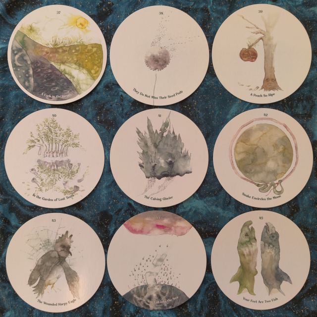 This is a 52-card circular deck with standard cardstock and a slight laminate finish. Some of the oracle messages are omens, such as “A Swarm of Bees,” “The Coiled Snake,” or “The Exploding Star.” You’ll get messages like “Your Ears Become a Butterfly” and “Clouds Pass but the Mountain Remains,” evocative of the pithy figurative language often found in Taoist texts.