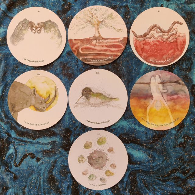 Accompanying the watercolor images are stories and thought exercises you’ll find in the guidebook. The symbology of the card is explained, in addition to divinatory guidance, practicums for how to use the card image as an icon or point of focus in meditation, the portal that card represents, creative prompts, and most notably, what the card is saying to you about environmental health and sustainability– what is the ecological connection here?