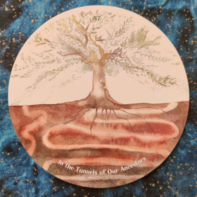 Card 46, The Unburdened Bones, connects you to deciduous trees as teachers of the process of letting go of the necessary, and resting in the most essential of one’s being. But electric lights near deciduous trees hinder their ability to drop their leaves in autumn, and so the leaves remain hanging, clinging to the branches growing old and brittle through the winter. It’s a disturbance of the natural cycle.