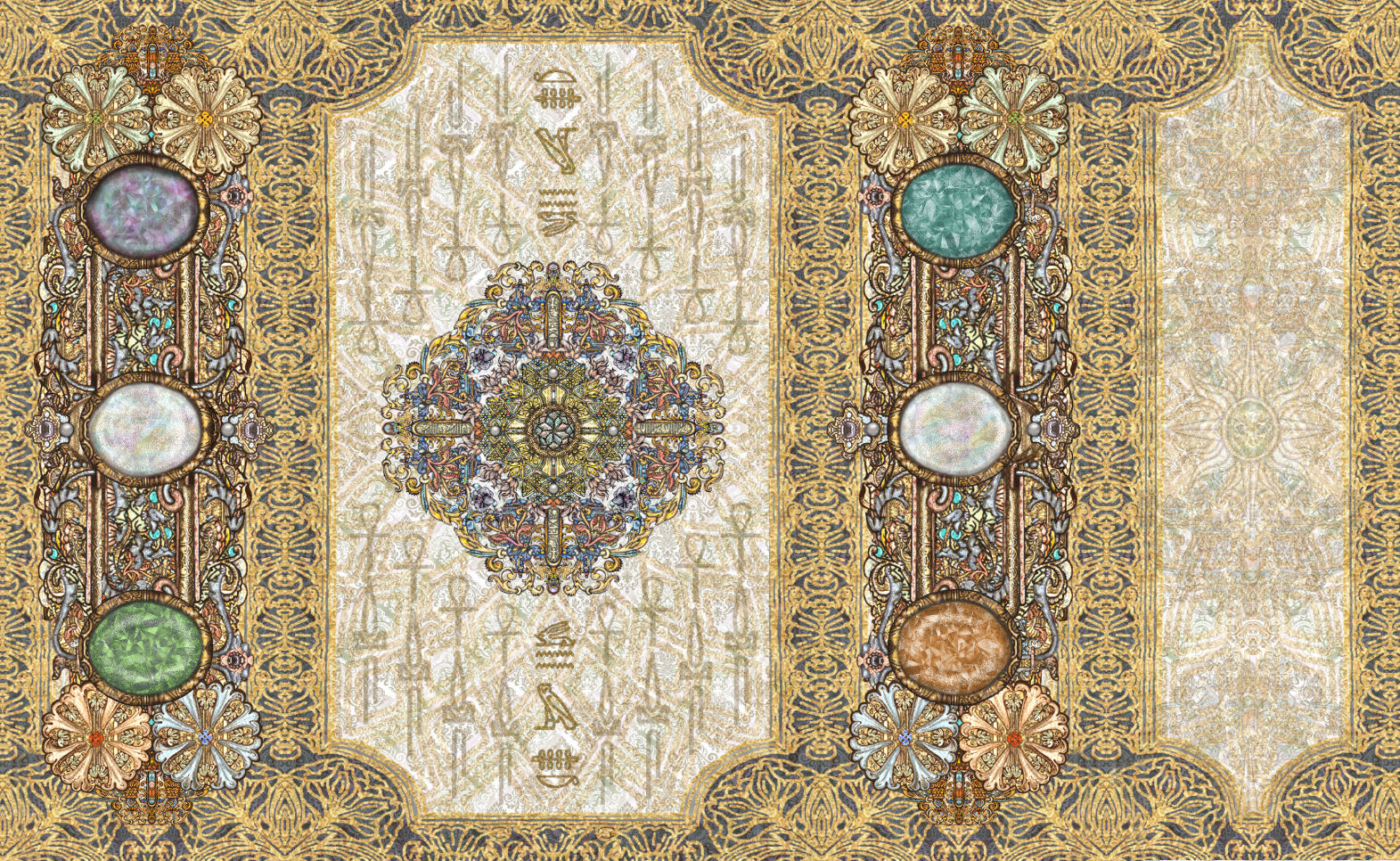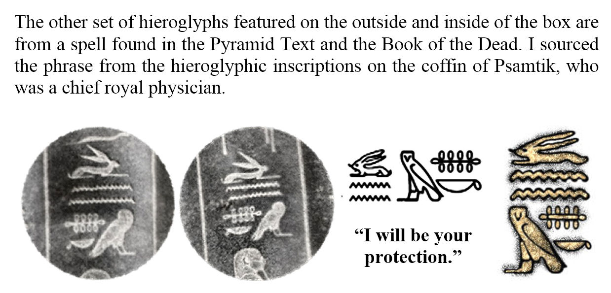 The repeating lines read, “Life/Immortality, Prosperity, and Health/Wellness” (the ankh, the wedja, and the seneb), found on the Rosetta stone, and oft found appearing alongside the names of pharaohs.