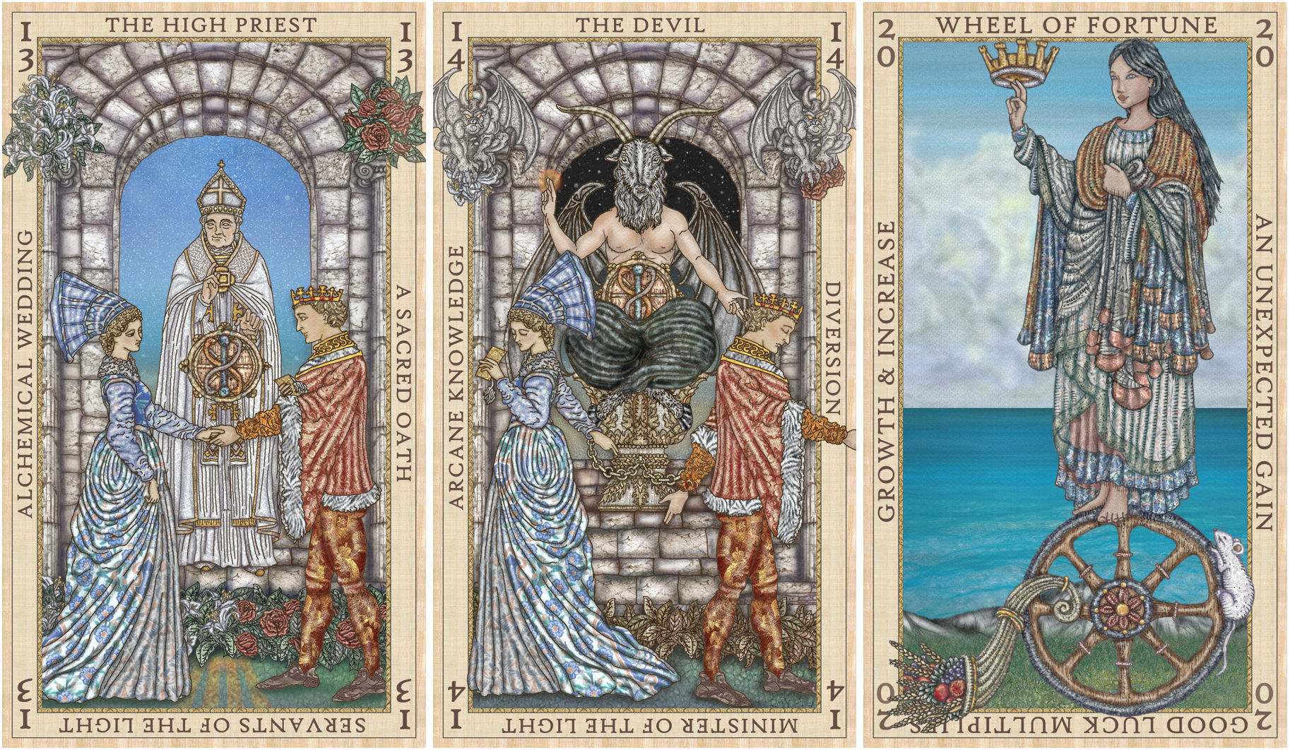 The biggest difference between the Spirit Keeper’s Tarot and this Etteilla project is my interpretative approach. With the SKT, I departed quite a bit from both RWS and Thoth, though it’s evidently inspired by both.