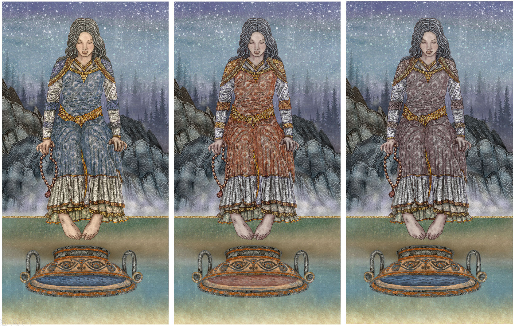Here are varying drafts of my illustration for the Etteilla Four of Swords. My art process begins with sketches by hand that I then scan in, clean up, and digitally color. I also separate out each feature in the composition as its own layer, so I can move around the pieces, resize, etc.