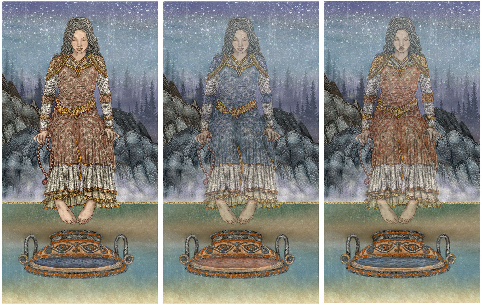 In my first draft my thought was for the kylix (in the reversed position) to be filled with red wine, but the resulting drawing looks more like blood. Yikes. And also the open sky behind the woman looked a bit bare. Sure, open sky and airy makes sense for a Swords card (element Air), but still.