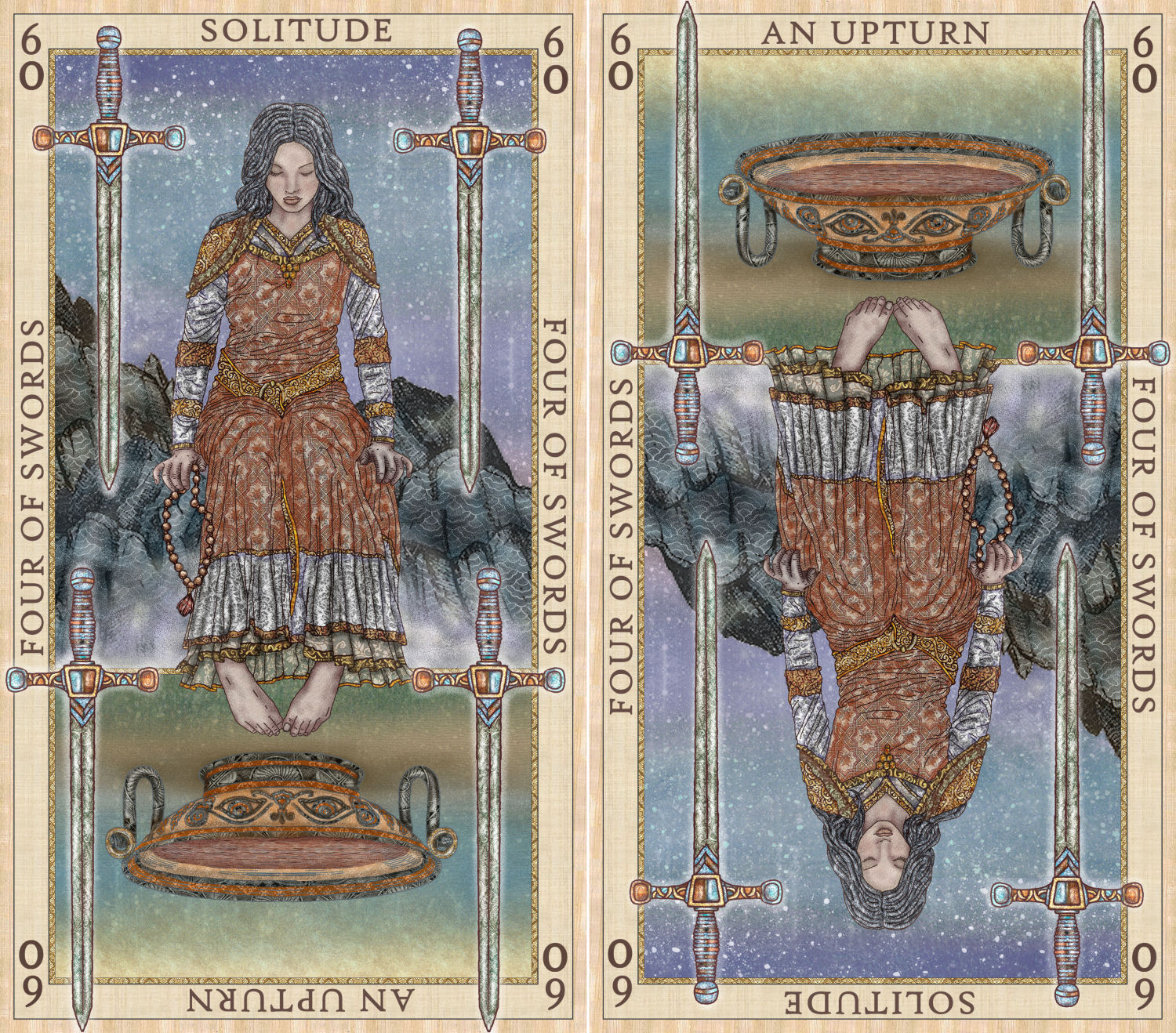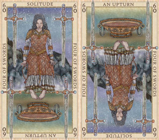 I’ve been trying to summon the motivation to resume my reconstructed Etteilla Tarot project. Funny… the card I resume on is the Four of Swords, which perfectly captures how I’ve been feeling.