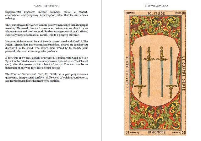 Whereas with this Etteilla project, I’m trying to stay close to “book meaning” as found in authoritative texts. Even when I vary slightly from what you see on the Etteilla I, II, or III, there’s still documented precedence for that expression of the card via “book meaning.”