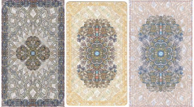 Scanned proofs of card back designs. Left: 2021 first printing. Center: 2021 certificate. Right: 2023 second printing (but no, this is awful; must revise).