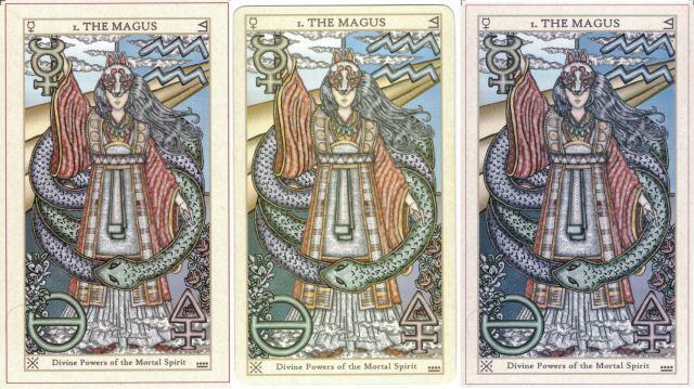 Look at the differences between the various printings of The Magus card: